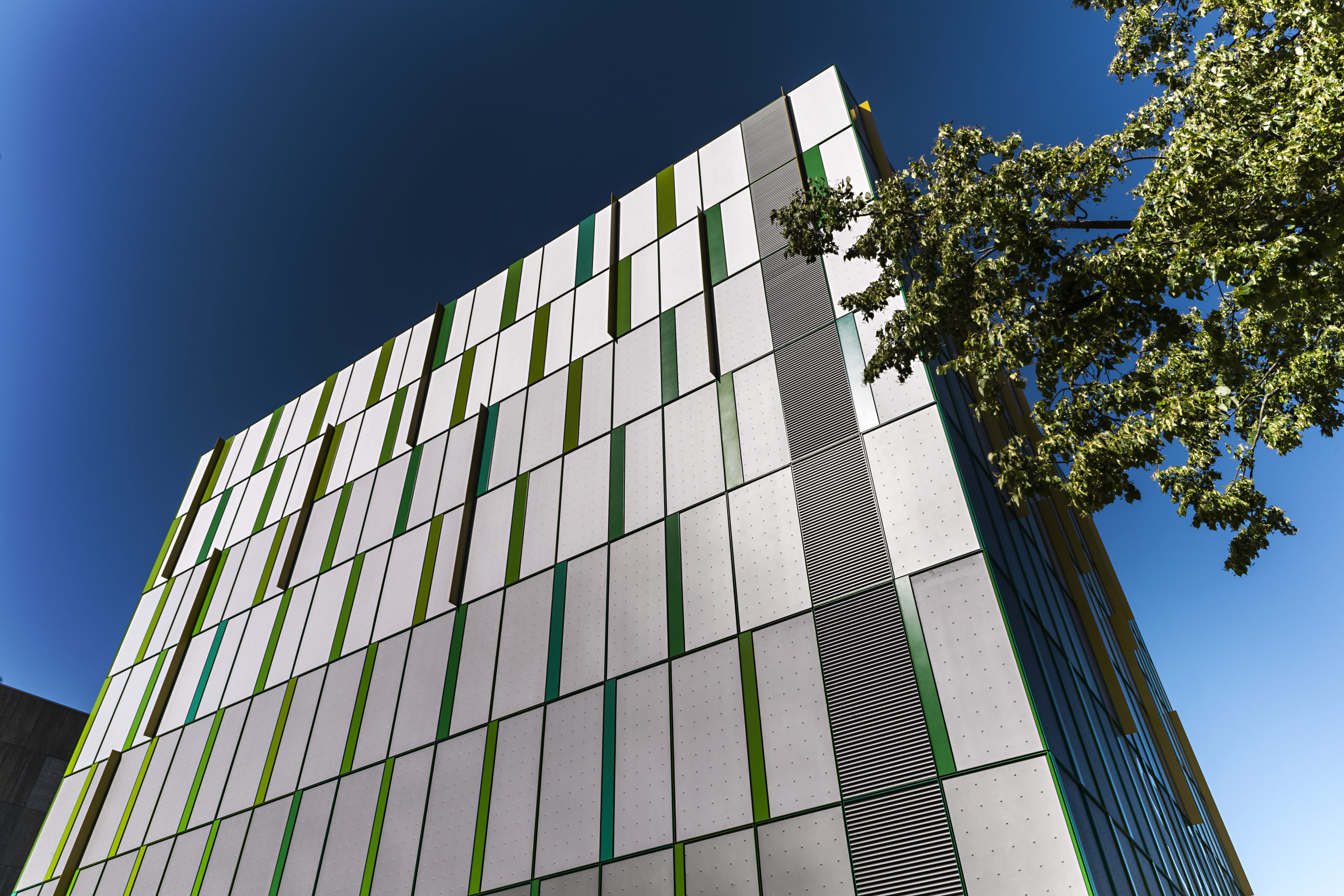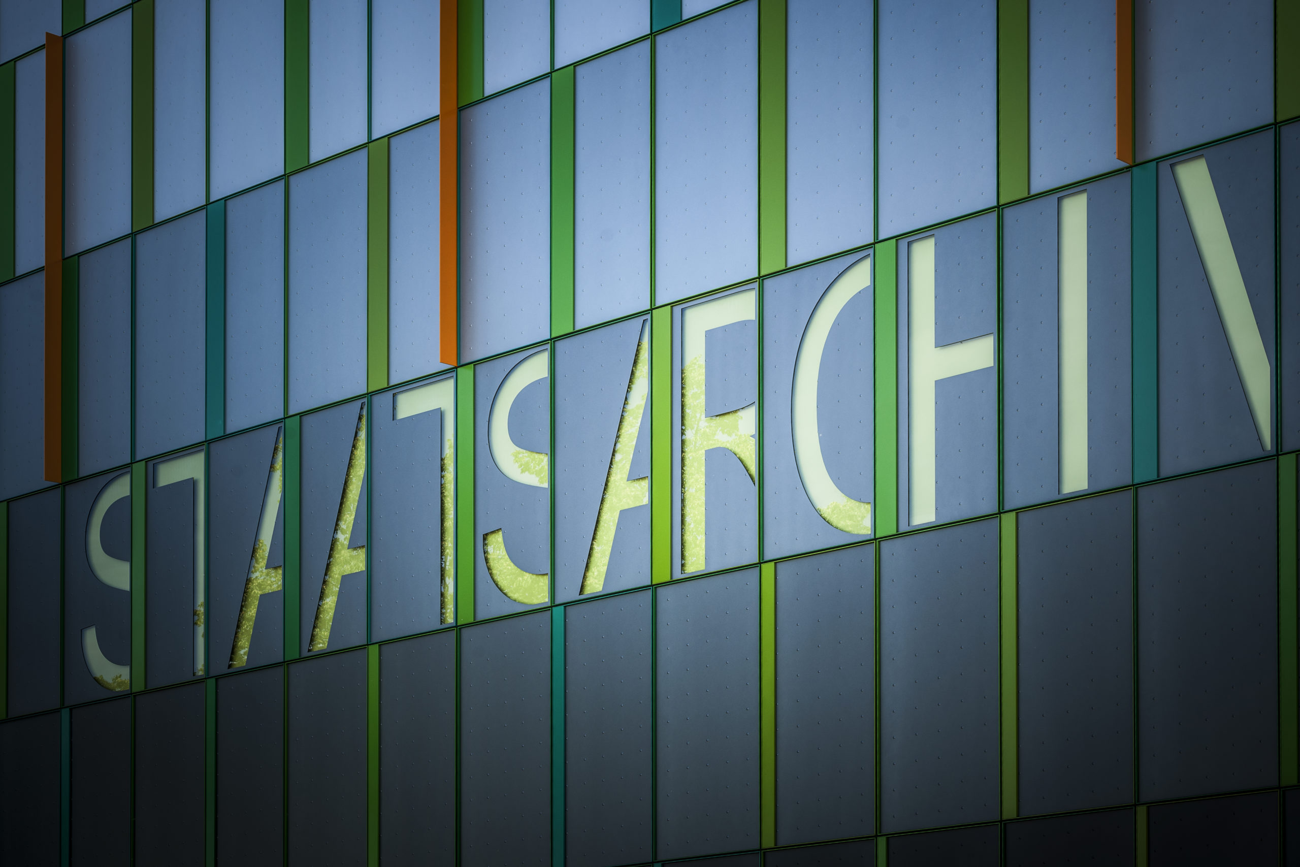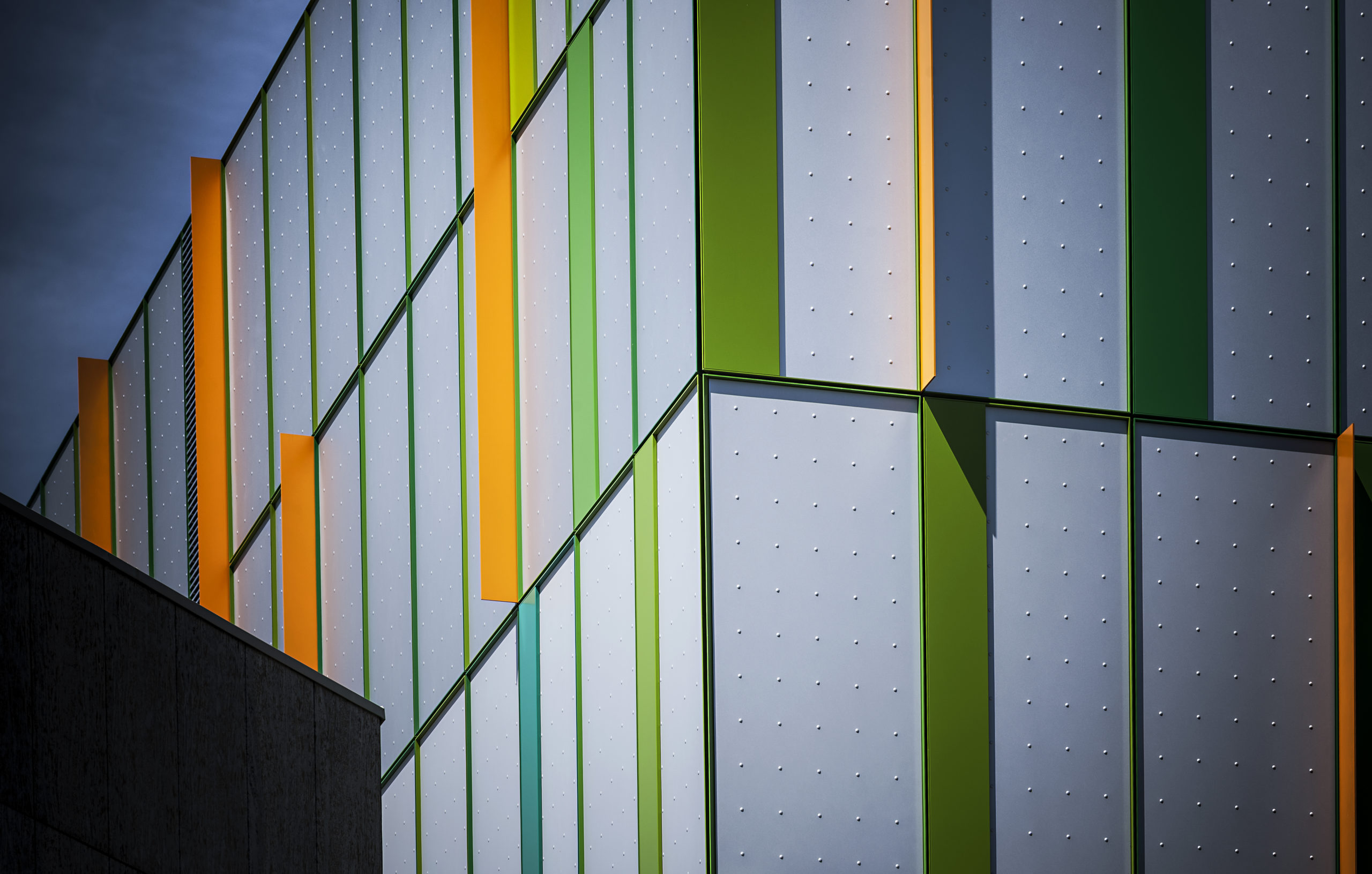 Die Fassade besteht aus Aluminium-Kassetten mit einer Fluorpolymerbeschichtung in Metallic-Eisenglimmer. Die Metall-Kassetten haben eine Noppen-struktur in nach oben heller werdenden Grautönen. Die Oberfläche der Rahmenprofile ist in unterschiedlichen Grüntönen PUR-beschichtet. Dazwischen kontrastieren orangene Fassadenschwerter.